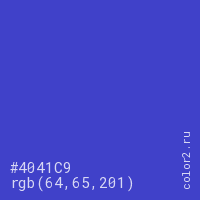 Цвет #4041C9 в цветовой модели RGB обозначается тремя октетами (64, 65, 201) в десятичном формате и #4041C9 в шестнадцатиричном (hex) формате, которые являются интенсивностью красного 64 (hex 40), интенсивность зелёного 65 (hex 41) и интенсивность синего 201 (hex C9).