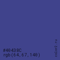 Цвет #40438C в цветовой модели RGB обозначается тремя октетами (64, 67, 140) в десятичном формате и #40438C в шестнадцатиричном (hex) формате, которые являются интенсивностью красного 64 (hex 40), интенсивность зелёного 67 (hex 43) и интенсивность синего 140 (hex 8C).