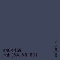 Цвет #404459 в цветовой модели RGB обозначается тремя октетами (64, 68, 89) в десятичном формате и #404459 в шестнадцатиричном (hex) формате, которые являются интенсивностью красного 64 (hex 40), интенсивность зелёного 68 (hex 44) и интенсивность синего 89 (hex 59).