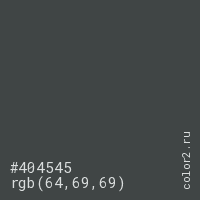 Цвет #404545 в цветовой модели RGB обозначается тремя октетами (64, 69, 69) в десятичном формате и #404545 в шестнадцатиричном (hex) формате, которые являются интенсивностью красного 64 (hex 40), интенсивность зелёного 69 (hex 45) и интенсивность синего 69 (hex 45).