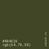 Цвет #404626 в цветовой модели RGB обозначается тремя октетами (64, 70, 38) в десятичном формате и #404626 в шестнадцатиричном (hex) формате, которые являются интенсивностью красного 64 (hex 40), интенсивность зелёного 70 (hex 46) и интенсивность синего 38 (hex 26).