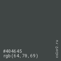 Цвет #404645 в цветовой модели RGB обозначается тремя октетами (64, 70, 69) в десятичном формате и #404645 в шестнадцатиричном (hex) формате, которые являются интенсивностью красного 64 (hex 40), интенсивность зелёного 70 (hex 46) и интенсивность синего 69 (hex 45).