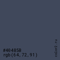 Цвет #40485B в цветовой модели RGB обозначается тремя октетами (64, 72, 91) в десятичном формате и #40485B в шестнадцатиричном (hex) формате, которые являются интенсивностью красного 64 (hex 40), интенсивность зелёного 72 (hex 48) и интенсивность синего 91 (hex 5B).