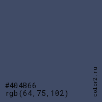 Цвет #404B66 в цветовой модели RGB обозначается тремя октетами (64, 75, 102) в десятичном формате и #404B66 в шестнадцатиричном (hex) формате, которые являются интенсивностью красного 64 (hex 40), интенсивность зелёного 75 (hex 4B) и интенсивность синего 102 (hex 66).
