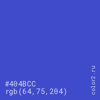 Цвет #404BCC в цветовой модели RGB обозначается тремя октетами (64, 75, 204) в десятичном формате и #404BCC в шестнадцатиричном (hex) формате, которые являются интенсивностью красного 64 (hex 40), интенсивность зелёного 75 (hex 4B) и интенсивность синего 204 (hex CC).