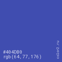 Цвет #404DB0 в цветовой модели RGB обозначается тремя октетами (64, 77, 176) в десятичном формате и #404DB0 в шестнадцатиричном (hex) формате, которые являются интенсивностью красного 64 (hex 40), интенсивность зелёного 77 (hex 4D) и интенсивность синего 176 (hex B0).
