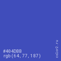 Цвет #404DBB в цветовой модели RGB обозначается тремя октетами (64, 77, 187) в десятичном формате и #404DBB в шестнадцатиричном (hex) формате, которые являются интенсивностью красного 64 (hex 40), интенсивность зелёного 77 (hex 4D) и интенсивность синего 187 (hex BB).