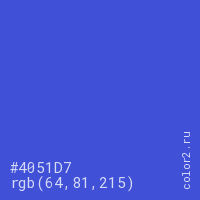 Цвет #4051D7 в цветовой модели RGB обозначается тремя октетами (64, 81, 215) в десятичном формате и #4051D7 в шестнадцатиричном (hex) формате, которые являются интенсивностью красного 64 (hex 40), интенсивность зелёного 81 (hex 51) и интенсивность синего 215 (hex D7).