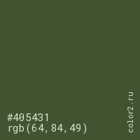 Цвет #405431 в цветовой модели RGB обозначается тремя октетами (64, 84, 49) в десятичном формате и #405431 в шестнадцатиричном (hex) формате, которые являются интенсивностью красного 64 (hex 40), интенсивность зелёного 84 (hex 54) и интенсивность синего 49 (hex 31).