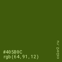 Цвет #405B0C в цветовой модели RGB обозначается тремя октетами (64, 91, 12) в десятичном формате и #405B0C в шестнадцатиричном (hex) формате, которые являются интенсивностью красного 64 (hex 40), интенсивность зелёного 91 (hex 5B) и интенсивность синего 12 (hex 0C).