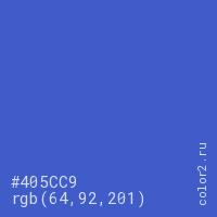 Цвет #405CC9 в цветовой модели RGB обозначается тремя октетами (64, 92, 201) в десятичном формате и #405CC9 в шестнадцатиричном (hex) формате, которые являются интенсивностью красного 64 (hex 40), интенсивность зелёного 92 (hex 5C) и интенсивность синего 201 (hex C9).