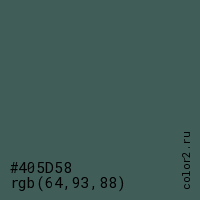 Цвет #405D58 в цветовой модели RGB обозначается тремя октетами (64, 93, 88) в десятичном формате и #405D58 в шестнадцатиричном (hex) формате, которые являются интенсивностью красного 64 (hex 40), интенсивность зелёного 93 (hex 5D) и интенсивность синего 88 (hex 58).