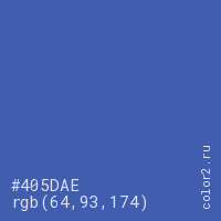 Цвет #405DAE в цветовой модели RGB обозначается тремя октетами (64, 93, 174) в десятичном формате и #405DAE в шестнадцатиричном (hex) формате, которые являются интенсивностью красного 64 (hex 40), интенсивность зелёного 93 (hex 5D) и интенсивность синего 174 (hex AE).