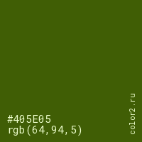 Цвет #405E05 в цветовой модели RGB обозначается тремя октетами (64, 94, 5) в десятичном формате и #405E05 в шестнадцатиричном (hex) формате, которые являются интенсивностью красного 64 (hex 40), интенсивность зелёного 94 (hex 5E) и интенсивность синего 5 (hex 05).