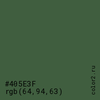 Цвет #405E3F в цветовой модели RGB обозначается тремя октетами (64, 94, 63) в десятичном формате и #405E3F в шестнадцатиричном (hex) формате, которые являются интенсивностью красного 64 (hex 40), интенсивность зелёного 94 (hex 5E) и интенсивность синего 63 (hex 3F).