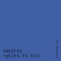 Цвет #405FA5 в цветовой модели RGB обозначается тремя октетами (64, 95, 165) в десятичном формате и #405FA5 в шестнадцатиричном (hex) формате, которые являются интенсивностью красного 64 (hex 40), интенсивность зелёного 95 (hex 5F) и интенсивность синего 165 (hex A5).