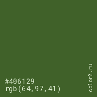 Цвет #406129 в цветовой модели RGB обозначается тремя октетами (64, 97, 41) в десятичном формате и #406129 в шестнадцатиричном (hex) формате, которые являются интенсивностью красного 64 (hex 40), интенсивность зелёного 97 (hex 61) и интенсивность синего 41 (hex 29).