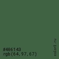 Цвет #406143 в цветовой модели RGB обозначается тремя октетами (64, 97, 67) в десятичном формате и #406143 в шестнадцатиричном (hex) формате, которые являются интенсивностью красного 64 (hex 40), интенсивность зелёного 97 (hex 61) и интенсивность синего 67 (hex 43).