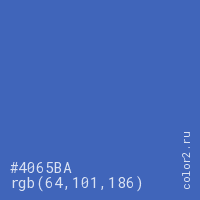 Цвет #4065BA в цветовой модели RGB обозначается тремя октетами (64, 101, 186) в десятичном формате и #4065BA в шестнадцатиричном (hex) формате, которые являются интенсивностью красного 64 (hex 40), интенсивность зелёного 101 (hex 65) и интенсивность синего 186 (hex BA).