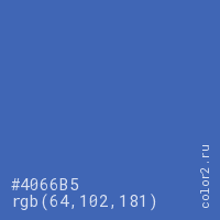 Цвет #4066B5 в цветовой модели RGB обозначается тремя октетами (64, 102, 181) в десятичном формате и #4066B5 в шестнадцатиричном (hex) формате, которые являются интенсивностью красного 64 (hex 40), интенсивность зелёного 102 (hex 66) и интенсивность синего 181 (hex B5).