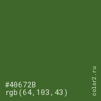 Цвет #40672B в цветовой модели RGB обозначается тремя октетами (64, 103, 43) в десятичном формате и #40672B в шестнадцатиричном (hex) формате, которые являются интенсивностью красного 64 (hex 40), интенсивность зелёного 103 (hex 67) и интенсивность синего 43 (hex 2B).