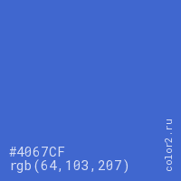 Цвет #4067CF в цветовой модели RGB обозначается тремя октетами (64, 103, 207) в десятичном формате и #4067CF в шестнадцатиричном (hex) формате, которые являются интенсивностью красного 64 (hex 40), интенсивность зелёного 103 (hex 67) и интенсивность синего 207 (hex CF).
