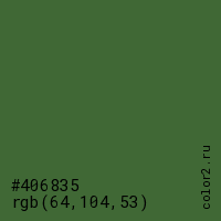 Цвет #406835 в цветовой модели RGB обозначается тремя октетами (64, 104, 53) в десятичном формате и #406835 в шестнадцатиричном (hex) формате, которые являются интенсивностью красного 64 (hex 40), интенсивность зелёного 104 (hex 68) и интенсивность синего 53 (hex 35).