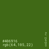 Цвет #406916 в цветовой модели RGB обозначается тремя октетами (64, 105, 22) в десятичном формате и #406916 в шестнадцатиричном (hex) формате, которые являются интенсивностью красного 64 (hex 40), интенсивность зелёного 105 (hex 69) и интенсивность синего 22 (hex 16).