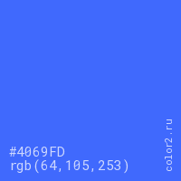 Цвет #4069FD в цветовой модели RGB обозначается тремя октетами (64, 105, 253) в десятичном формате и #4069FD в шестнадцатиричном (hex) формате, которые являются интенсивностью красного 64 (hex 40), интенсивность зелёного 105 (hex 69) и интенсивность синего 253 (hex FD).