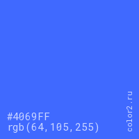 Цвет #4069FF в цветовой модели RGB обозначается тремя октетами (64, 105, 255) в десятичном формате и #4069FF в шестнадцатиричном (hex) формате, которые являются интенсивностью красного 64 (hex 40), интенсивность зелёного 105 (hex 69) и интенсивность синего 255 (hex FF).