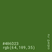 Цвет #406D23 в цветовой модели RGB обозначается тремя октетами (64, 109, 35) в десятичном формате и #406D23 в шестнадцатиричном (hex) формате, которые являются интенсивностью красного 64 (hex 40), интенсивность зелёного 109 (hex 6D) и интенсивность синего 35 (hex 23).