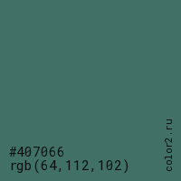 Цвет #407066 в цветовой модели RGB обозначается тремя октетами (64, 112, 102) в десятичном формате и #407066 в шестнадцатиричном (hex) формате, которые являются интенсивностью красного 64 (hex 40), интенсивность зелёного 112 (hex 70) и интенсивность синего 102 (hex 66).