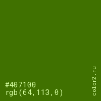Цвет #407100 в цветовой модели RGB обозначается тремя октетами (64, 113, 0) в десятичном формате и #407100 в шестнадцатиричном (hex) формате, которые являются интенсивностью красного 64 (hex 40), интенсивность зелёного 113 (hex 71) и интенсивность синего 0 (hex 00).