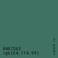 Цвет #407263 в цветовой модели RGB обозначается тремя октетами (64, 114, 99) в десятичном формате и #407263 в шестнадцатиричном (hex) формате, которые являются интенсивностью красного 64 (hex 40), интенсивность зелёного 114 (hex 72) и интенсивность синего 99 (hex 63).