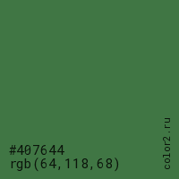 Цвет #407644 в цветовой модели RGB обозначается тремя октетами (64, 118, 68) в десятичном формате и #407644 в шестнадцатиричном (hex) формате, которые являются интенсивностью красного 64 (hex 40), интенсивность зелёного 118 (hex 76) и интенсивность синего 68 (hex 44).