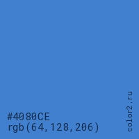 Цвет #4080CE в цветовой модели RGB обозначается тремя октетами (64, 128, 206) в десятичном формате и #4080CE в шестнадцатиричном (hex) формате, которые являются интенсивностью красного 64 (hex 40), интенсивность зелёного 128 (hex 80) и интенсивность синего 206 (hex CE).