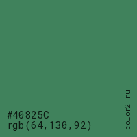 Цвет #40825C в цветовой модели RGB обозначается тремя октетами (64, 130, 92) в десятичном формате и #40825C в шестнадцатиричном (hex) формате, которые являются интенсивностью красного 64 (hex 40), интенсивность зелёного 130 (hex 82) и интенсивность синего 92 (hex 5C).