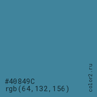 Цвет #40849C в цветовой модели RGB обозначается тремя октетами (64, 132, 156) в десятичном формате и #40849C в шестнадцатиричном (hex) формате, которые являются интенсивностью красного 64 (hex 40), интенсивность зелёного 132 (hex 84) и интенсивность синего 156 (hex 9C).