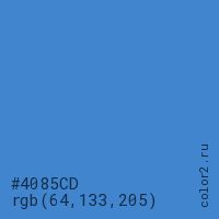 Цвет #4085CD в цветовой модели RGB обозначается тремя октетами (64, 133, 205) в десятичном формате и #4085CD в шестнадцатиричном (hex) формате, которые являются интенсивностью красного 64 (hex 40), интенсивность зелёного 133 (hex 85) и интенсивность синего 205 (hex CD).