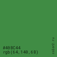 Цвет #408C44 в цветовой модели RGB обозначается тремя октетами (64, 140, 68) в десятичном формате и #408C44 в шестнадцатиричном (hex) формате, которые являются интенсивностью красного 64 (hex 40), интенсивность зелёного 140 (hex 8C) и интенсивность синего 68 (hex 44).
