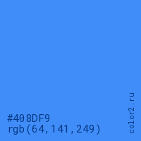 Цвет #408DF9 в цветовой модели RGB обозначается тремя октетами (64, 141, 249) в десятичном формате и #408DF9 в шестнадцатиричном (hex) формате, которые являются интенсивностью красного 64 (hex 40), интенсивность зелёного 141 (hex 8D) и интенсивность синего 249 (hex F9).