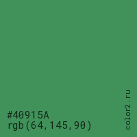 Цвет #40915A в цветовой модели RGB обозначается тремя октетами (64, 145, 90) в десятичном формате и #40915A в шестнадцатиричном (hex) формате, которые являются интенсивностью красного 64 (hex 40), интенсивность зелёного 145 (hex 91) и интенсивность синего 90 (hex 5A).