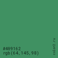 Цвет #409162 в цветовой модели RGB обозначается тремя октетами (64, 145, 98) в десятичном формате и #409162 в шестнадцатиричном (hex) формате, которые являются интенсивностью красного 64 (hex 40), интенсивность зелёного 145 (hex 91) и интенсивность синего 98 (hex 62).