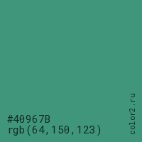 Цвет #40967B в цветовой модели RGB обозначается тремя октетами (64, 150, 123) в десятичном формате и #40967B в шестнадцатиричном (hex) формате, которые являются интенсивностью красного 64 (hex 40), интенсивность зелёного 150 (hex 96) и интенсивность синего 123 (hex 7B).