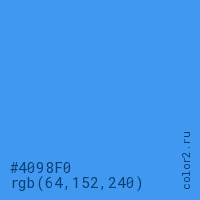 Цвет #4098F0 в цветовой модели RGB обозначается тремя октетами (64, 152, 240) в десятичном формате и #4098F0 в шестнадцатиричном (hex) формате, которые являются интенсивностью красного 64 (hex 40), интенсивность зелёного 152 (hex 98) и интенсивность синего 240 (hex F0).