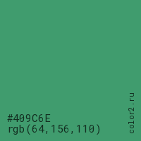 Цвет #409C6E в цветовой модели RGB обозначается тремя октетами (64, 156, 110) в десятичном формате и #409C6E в шестнадцатиричном (hex) формате, которые являются интенсивностью красного 64 (hex 40), интенсивность зелёного 156 (hex 9C) и интенсивность синего 110 (hex 6E).