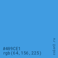 Цвет #409CE1 в цветовой модели RGB обозначается тремя октетами (64, 156, 225) в десятичном формате и #409CE1 в шестнадцатиричном (hex) формате, которые являются интенсивностью красного 64 (hex 40), интенсивность зелёного 156 (hex 9C) и интенсивность синего 225 (hex E1).