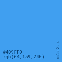Цвет #409FF0 в цветовой модели RGB обозначается тремя октетами (64, 159, 240) в десятичном формате и #409FF0 в шестнадцатиричном (hex) формате, которые являются интенсивностью красного 64 (hex 40), интенсивность зелёного 159 (hex 9F) и интенсивность синего 240 (hex F0).