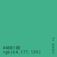 Цвет #40B18B в цветовой модели RGB обозначается тремя октетами (64, 177, 139) в десятичном формате и #40B18B в шестнадцатиричном (hex) формате, которые являются интенсивностью красного 64 (hex 40), интенсивность зелёного 177 (hex B1) и интенсивность синего 139 (hex 8B).