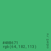 Цвет #40B671 в цветовой модели RGB обозначается тремя октетами (64, 182, 113) в десятичном формате и #40B671 в шестнадцатиричном (hex) формате, которые являются интенсивностью красного 64 (hex 40), интенсивность зелёного 182 (hex B6) и интенсивность синего 113 (hex 71).